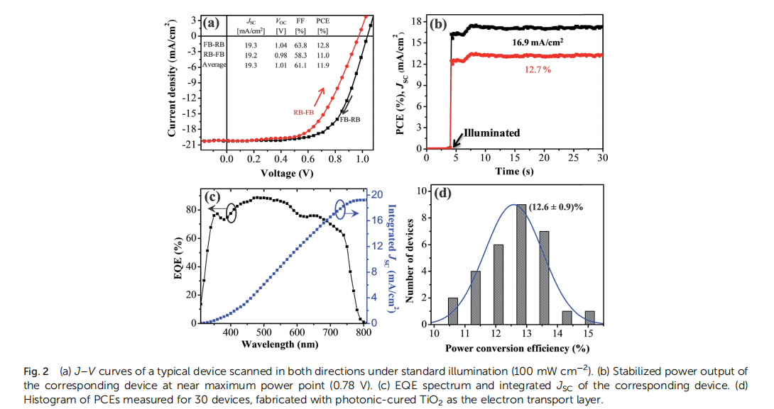 在這項(xiàng)工作中,我們證明了光子固化技術(shù)在氧化銦錫(ITO)涂層玻璃和PET基板上實(shí)現(xiàn)高質(zhì)量溶膠-凝膠處理的TiO2薄膜的可行性。此外,還研究了水分對(duì)鈣鈦礦薄膜生長和相關(guān)器件性能的影響。在光子固化TiO2層上采用優(yōu)化的鈣鈦礦薄膜生長制造的PSC在玻璃和柔性 PET 基板上的PCE分別高達(dá)15.0%和11.2%,與迄今為止報(bào)道的 PCE 相當(dāng)。